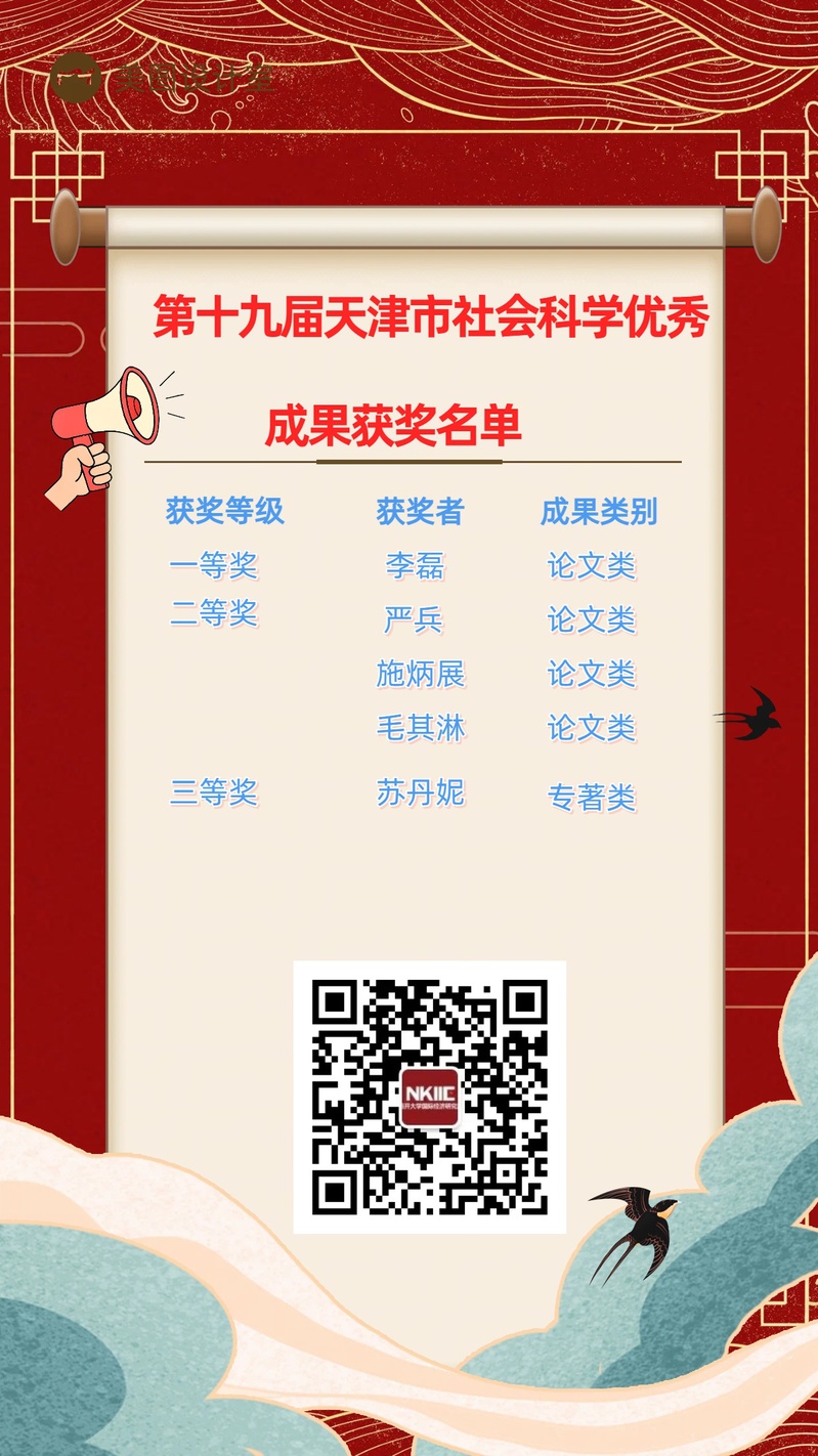 日前,天津市社会科学界联合会公示了第十九届天津市社会科学优秀成果奖评选结果,国经所李磊、严兵、施炳展、毛其淋、苏丹妮五位老师获奖,获奖公示如下: